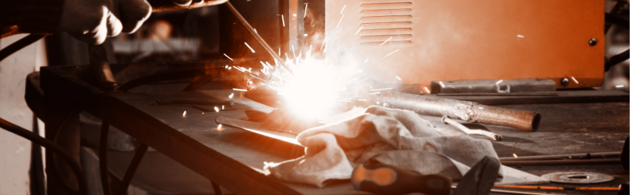 Osoba nosząca odzież ochronną spawa metal na stole warsztatowym, wytwarzając iskry.